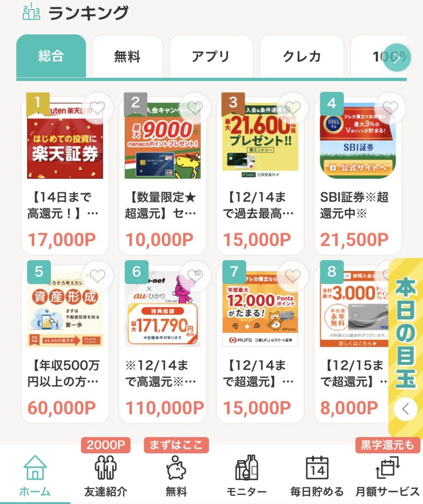 無料で作れるカードも多く、1案件で数千〜1万ポイント以上が狙える高還元ジャンル。「時間がある日」「キャンペーン中」に一気にポイントを稼ぎたい人に向いています。