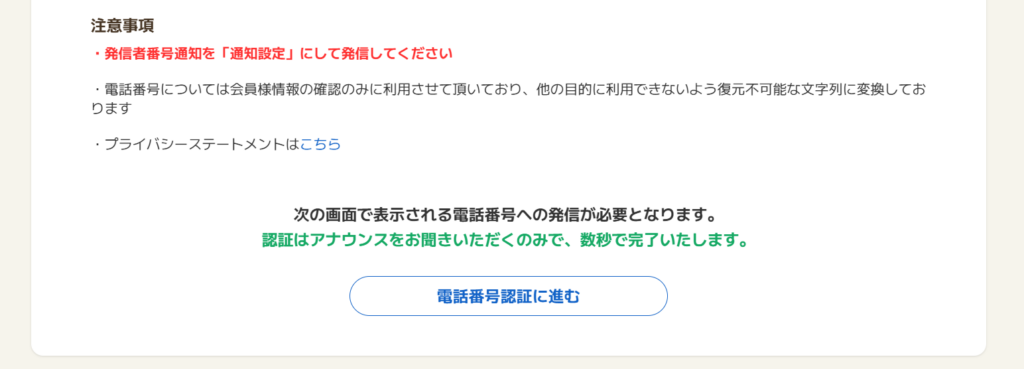 入力した電話番号から指定の番号へ発信し、180秒以内に認証を完了させます。音声ガイダンスに従うだけなので簡単に終わります。